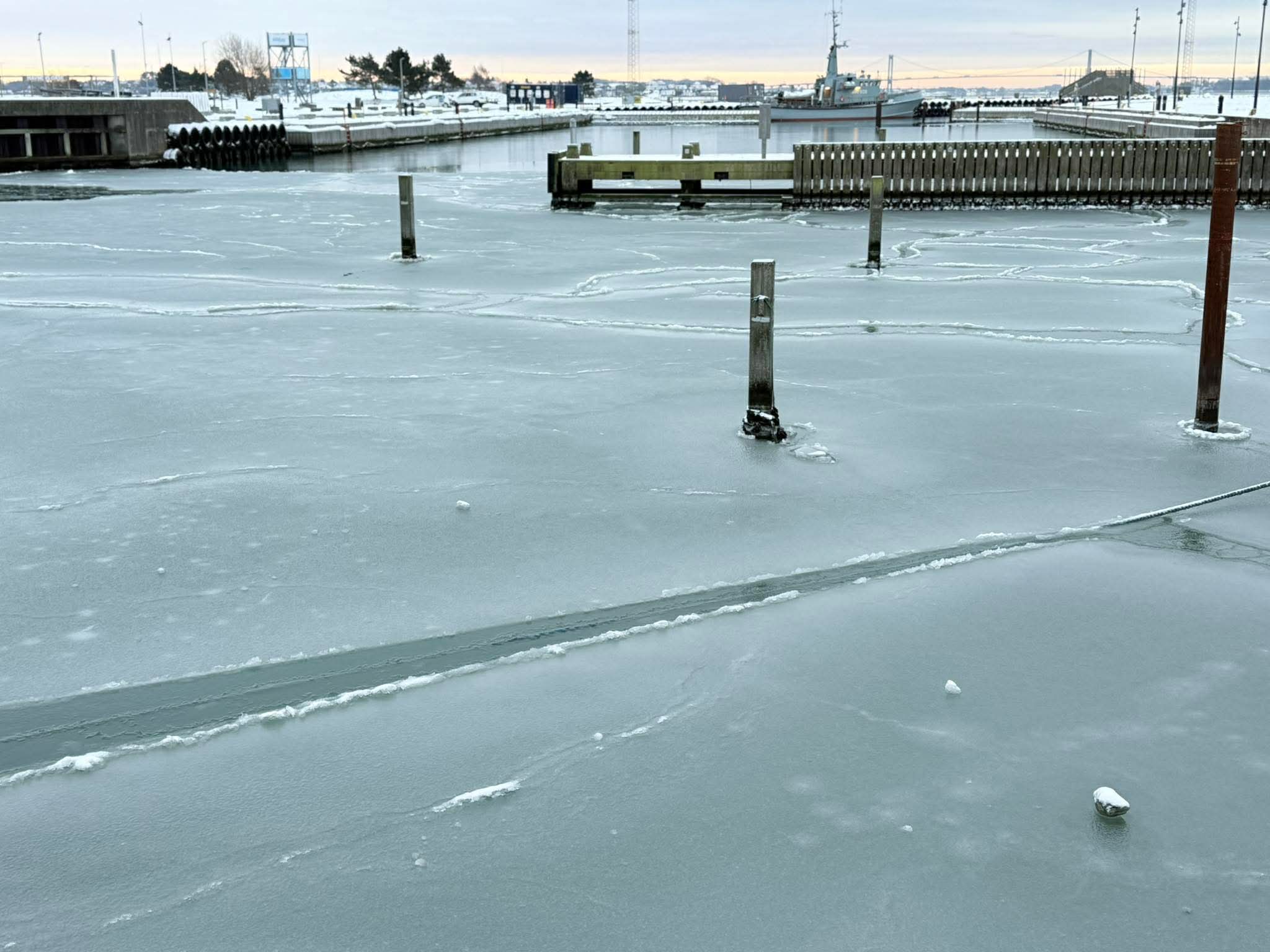 VEJRET. Hvem der de seneste dage har gået en tur langs Gammel Havn i Fredericia, har kunnet se et sjældent syn. Det stillestående vand i havnen ligger under et lag is, og det er fristende at tro, at Lillebælt er ved at fryse til.