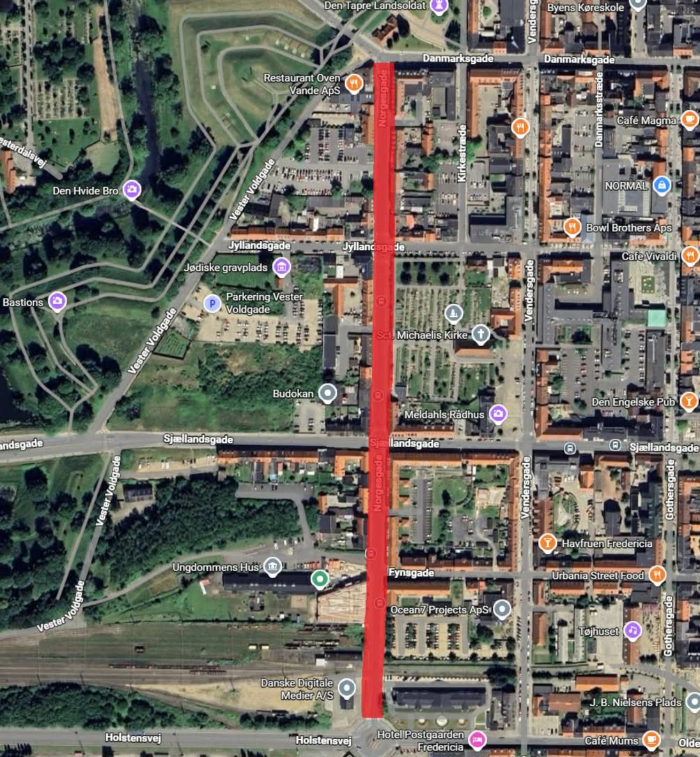 Efter en længere periode med anlægsarbejde på Norgesgade i Fredericia er slutningen nu i sigte. TREFOR udlægger mandag det sidste lag asfalt, og vejen forventes genåbnet for trafik tirsdag den 31. marts. Opmærkning af fodgængerfelter og kørebaneafmærkning sker efter påske.